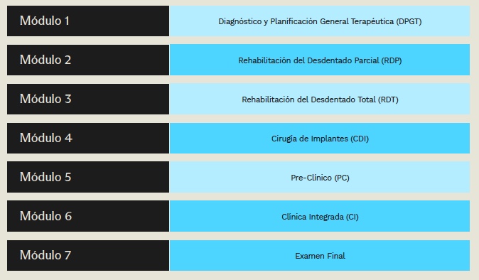 El programa está construido de manera de entregar sólidas bases científicas, técnicas y éticas, extendiendo a una creciente comunidad odontológica un programa que entregue las herramientas fundamentales en el tema específico a tratar, con un sello de excelencia tanto teórico como práctico, con el objetivo de promover la salud oral, diagnosticar y prevenir enfermedades del sistema estomatognático y otorgar una solución tanto protésica como quirúrgica a pacientes que requieran tratamiento para el desdentamiento de media y baja complejidad, mediante rehabilitaciones predecibles.