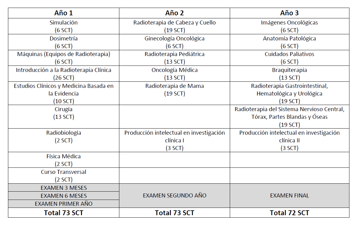 El programa de especialización busca entregar una formación teórica y práctica integral que permita al Oncólogo Radioterapeuta desenvolverse en forma independiente en el ámbito nacional, y que le permita estar al día en el ámbito internacional. El Oncólogo Radioterapeuta formado en este programa tendrá experiencia suficiente para trabajar en forma multidisciplinaria con el resto de las especialidades dedicadas a la Oncología y habrá producido durante su formación investigación original en el ámbito biomédico.