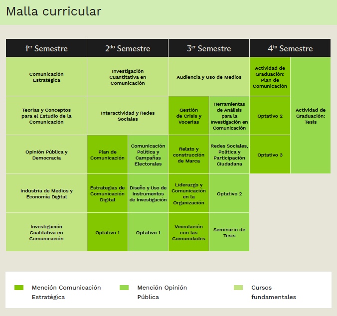 La Mención en Opinión Pública es de carácter académico y está enfocada en la investigación sobre el acceso y uso a medios de comunicación, los efectos mediáticos, los medios y la participación política, la brecha digital y la comunicación en el ámbito de las políticas públicas.