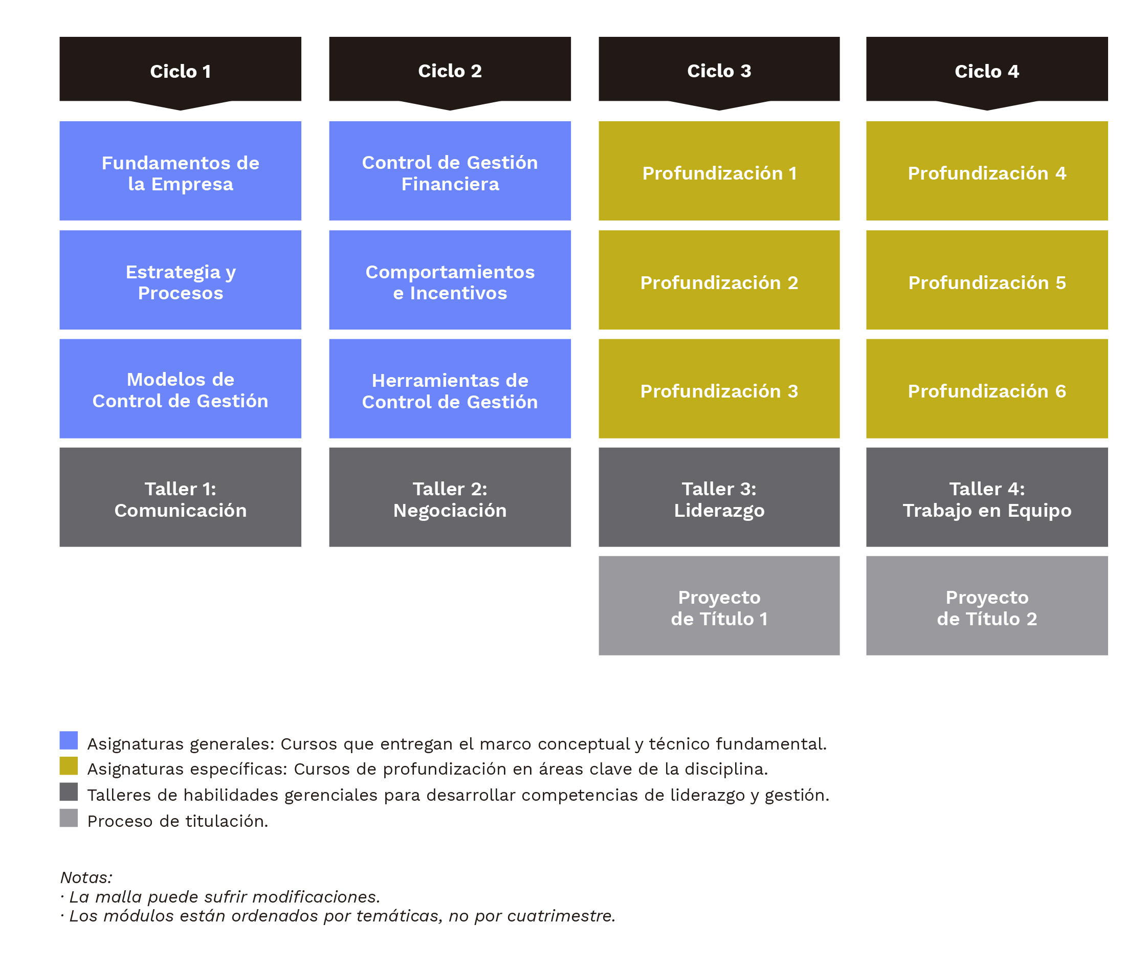 HíbridaEl objetivo del programa es contribuir a la formación de especialistas en control de gestión, proporcionando conocimientos para comprender el fenómeno del control dentro de organizaciones y los enfoques, técnicas y herramientas para llevarlo a la práctica. Con esto el programa busca formar profesionales que posean conocimientos y dominen herramientas modernas para diseñar, operar y mantener sistemas de control de gestión en distintos tipos de organizaciones