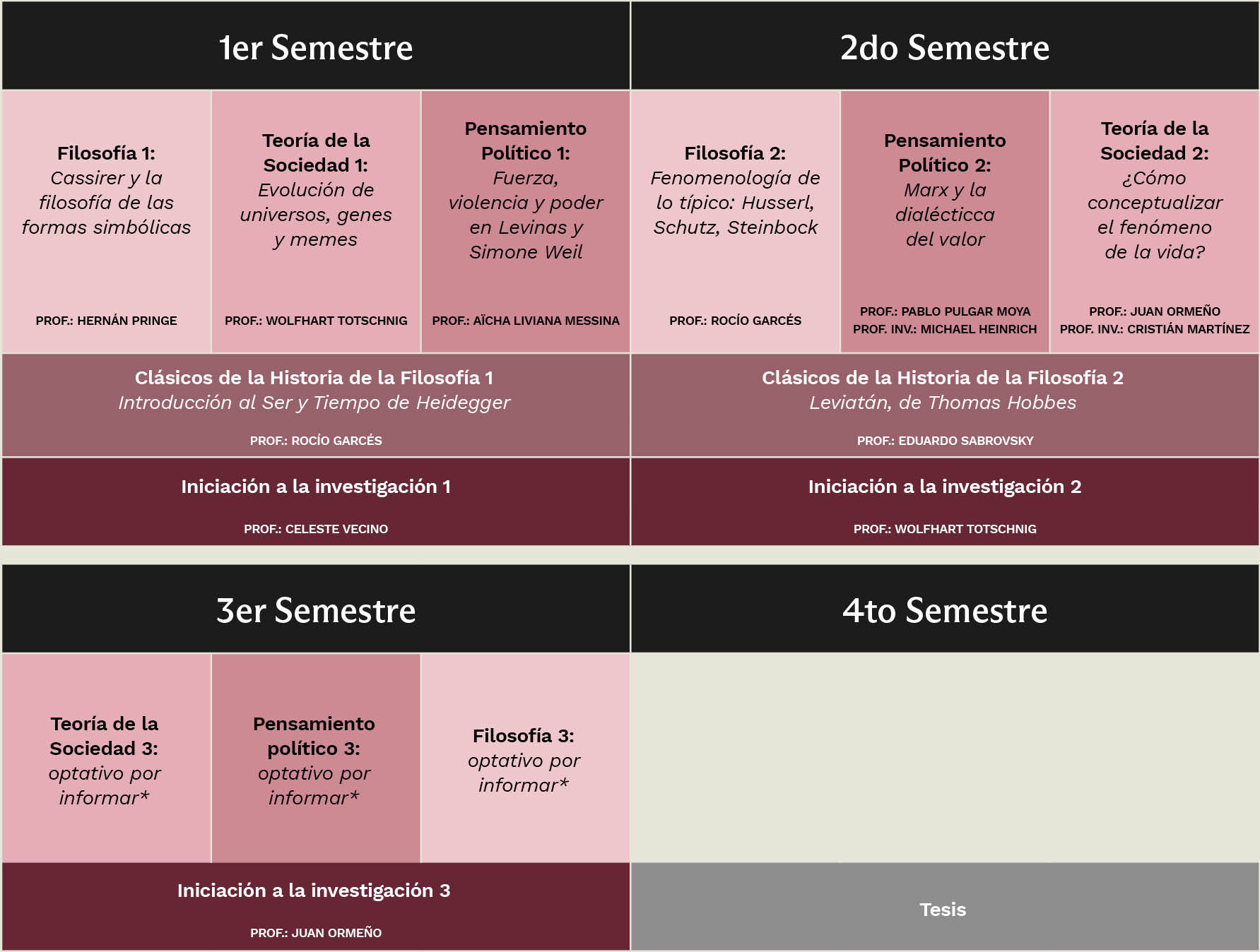 El Magíster consta de 12 cursos modulares y semestrales. Los estudiantes deberán cursar 8 cursos temáticos, entre modulares y electivos, y 4 cursos metodológicos. Salvo el curso modular Filosofía I, que es obligatorio, los demás cursos temáticos son de libre elección.