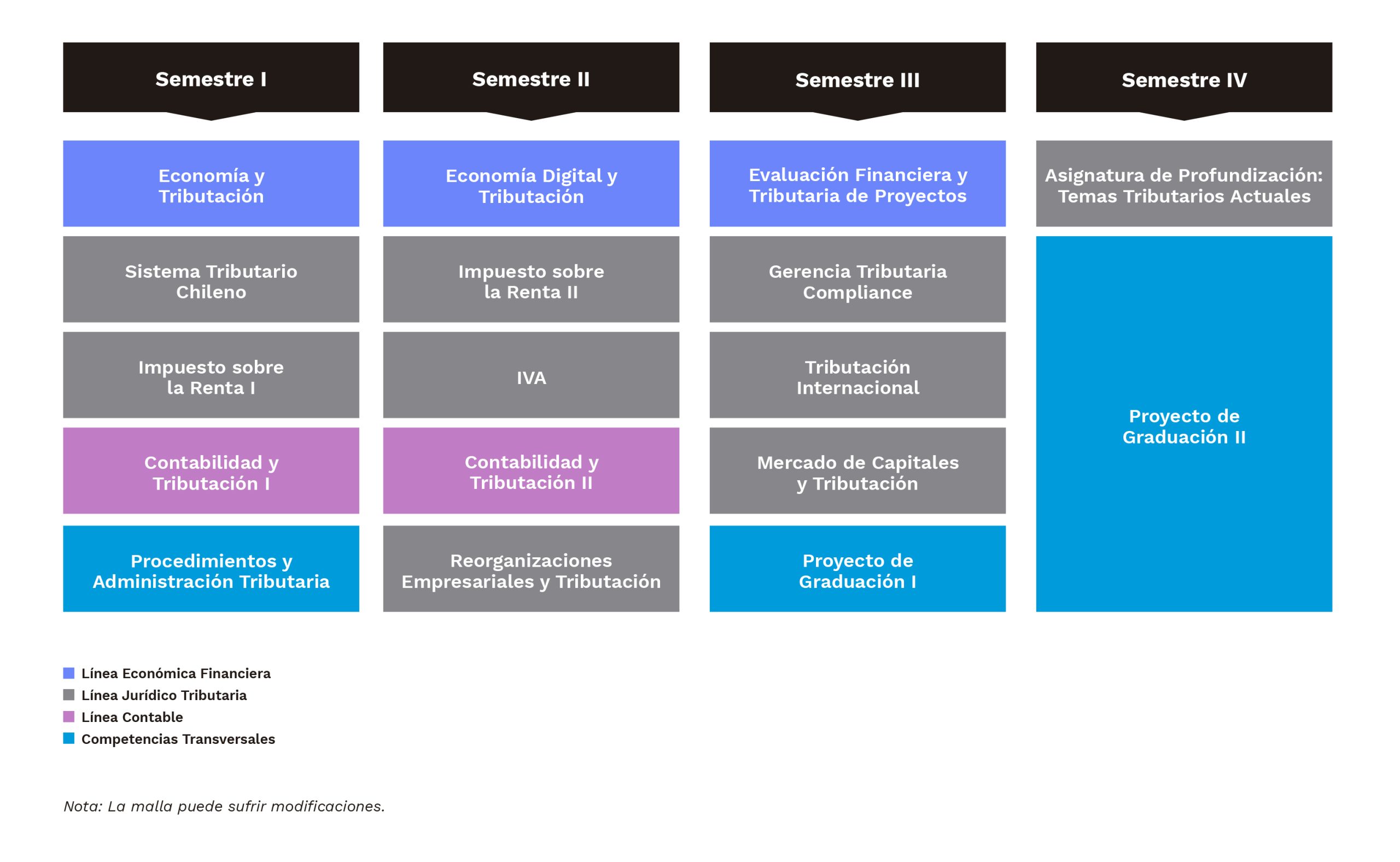 Línea de Derecho Tributario: Esta línea ofrece una comprensión integral del sistema tributario chileno y su contexto global, permitiendo a los estudiantes explorar el impacto y la interacción de los impuestos en los ámbitos público y privado desde una perspectiva jurídica y económica. Se pone un fuerte énfasis en la capacidad para asesorar a clientes, realizar controles tributarios en empresas y desarrollar un análisis crítico del sistema tributario, considerando también principios económicos implícitos en la tributación. Los estudiantes tendrán acceso a perspectivas teóricas y prácticas que les permitirán desenvolverse con éxito en un entorno tributario complejo y cambiante. Su operacionalización se desarrolla a través de las asignaturas correspondientes al eje formativo: “Jurídico Tributaria”.